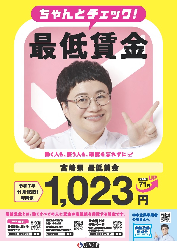 宮崎県の最低賃金について 2025/10/15 宮崎労働局長は、宮崎県最低賃金を1時間あたり1,023円とすることを決定し、令和7年11月16日(日)から発効することとなりました。 つきましては、求人票の時給単価をご確認ください。 宮崎労働局最低賃金の案内ページ
